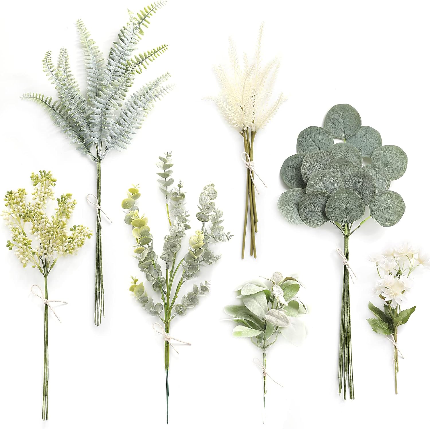 - 46pcs with 7 Kinds;Silver Dollar Eucalyptus leaves(2") x15,white Lotus flowers x3(12 heads).Lambs Ear Leaves x3.dusty baby eucalyptus leaves x3(15 heads),fern leaf x10 ,Simulated Flower Buds x7,white lavender x5