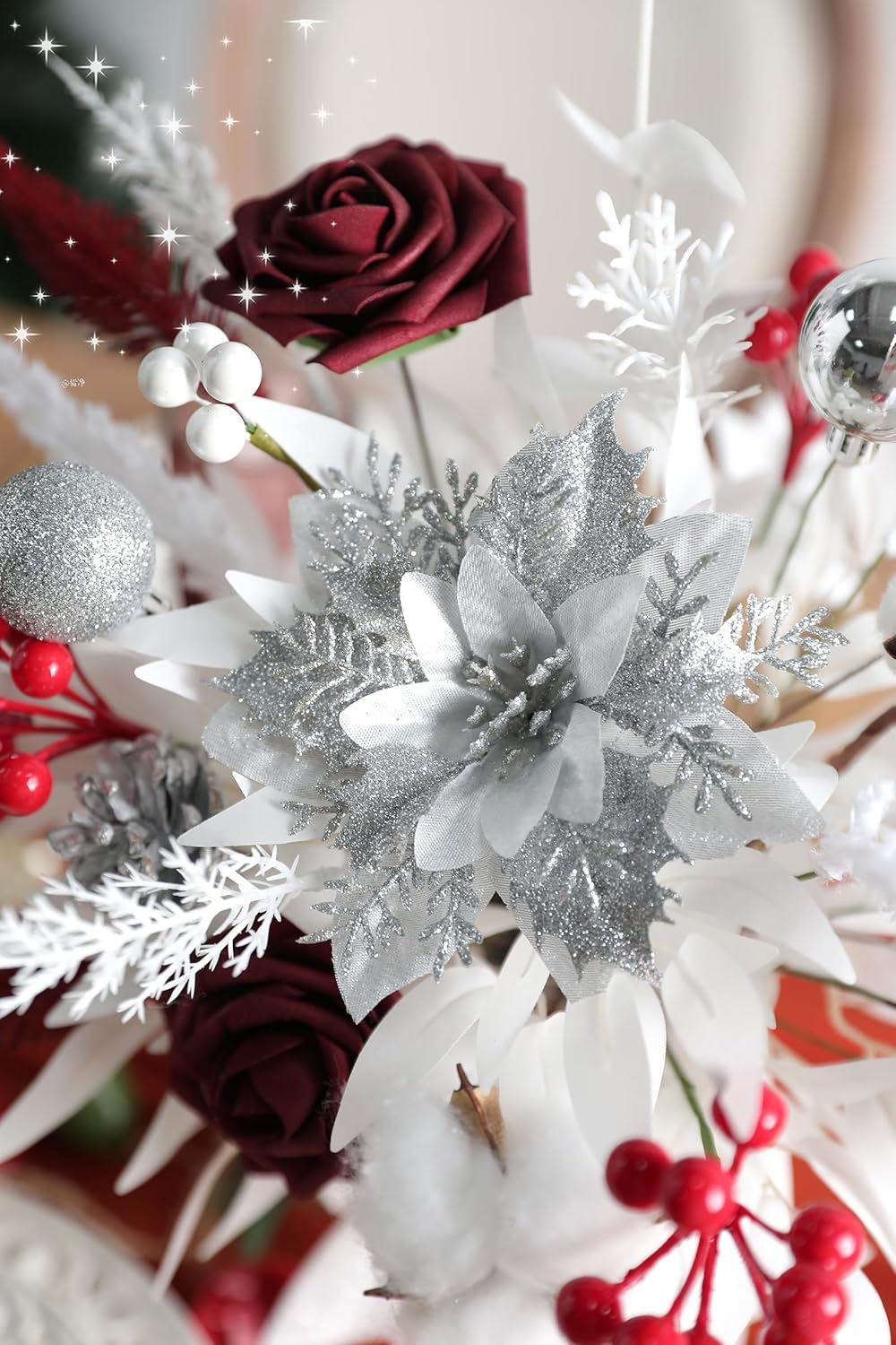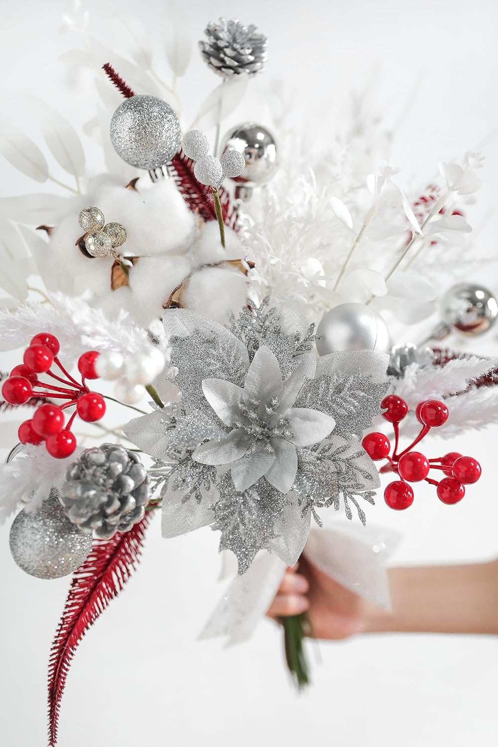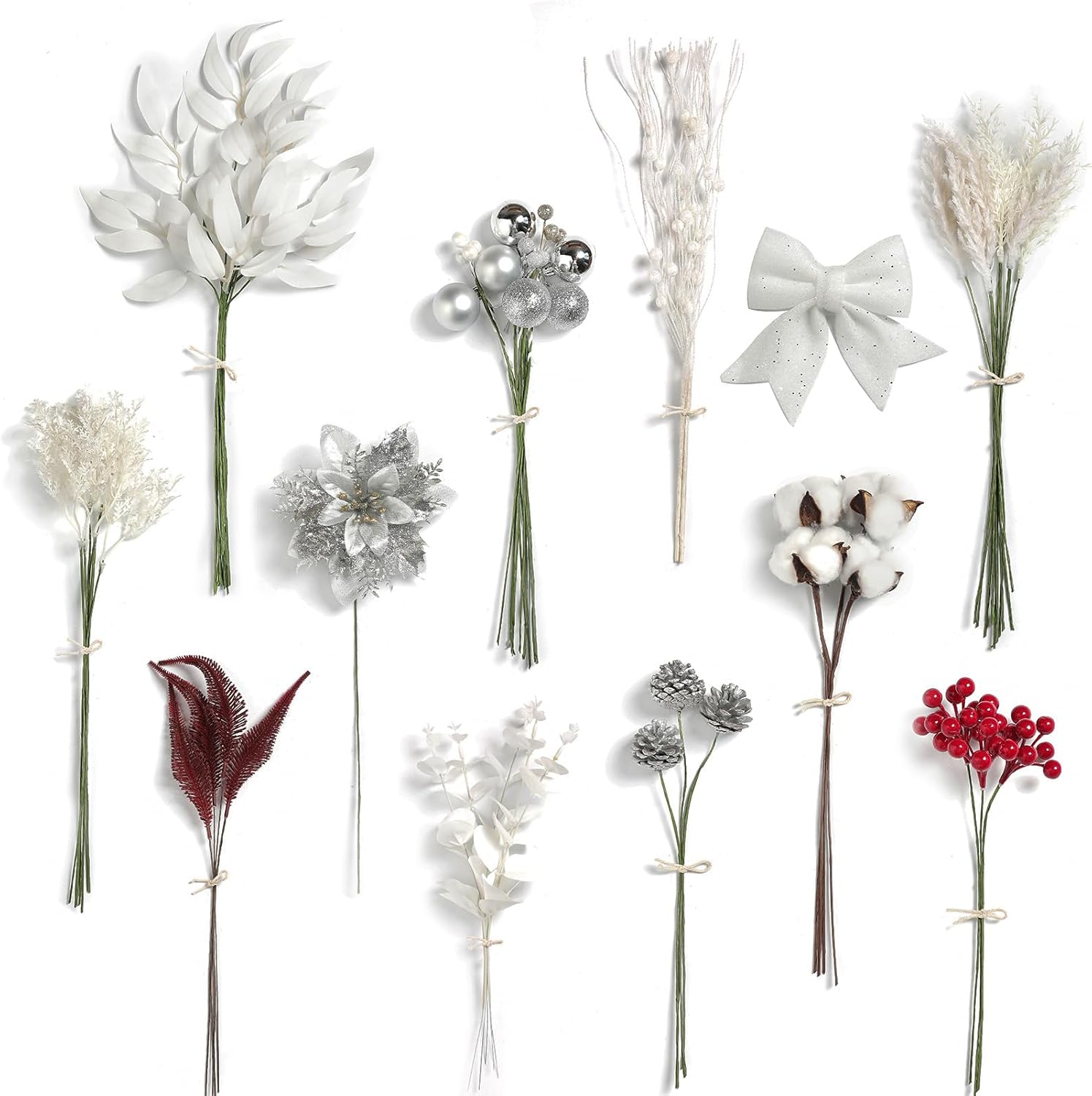 - 58pcs with 12 Kinds;Artificial Red Berry Stems x3,Christmas Balls and Bead Sticks x9,Pine Cones x3,Cotton Stems x4,Eucalyptus Leaves x5,willow leaf x10,Christmas Poinsettia x1,Christmas Bow x1,Artificial Glitter Berry Stem x2,Bunny Tails Grass x4,white astilbe x10,Baby Leaf Fern x6