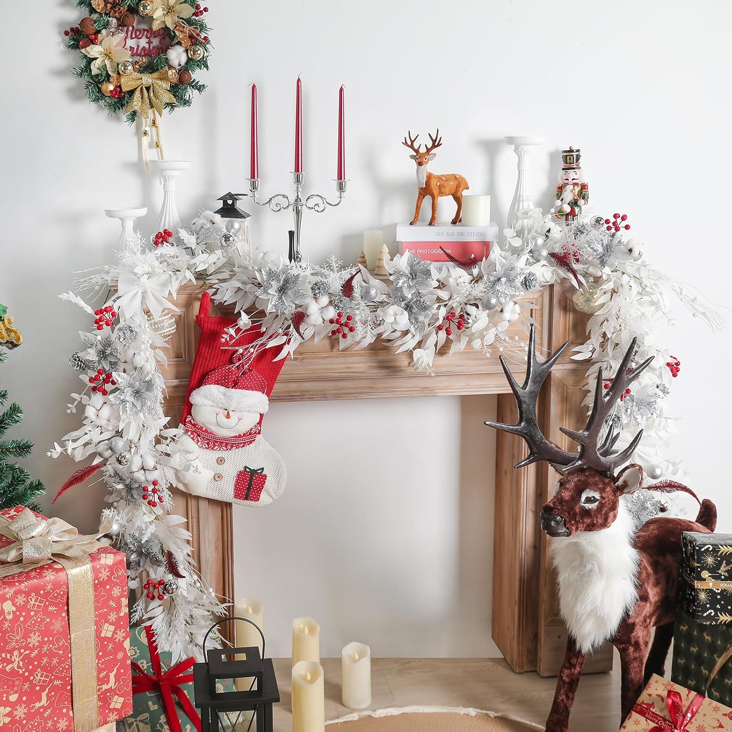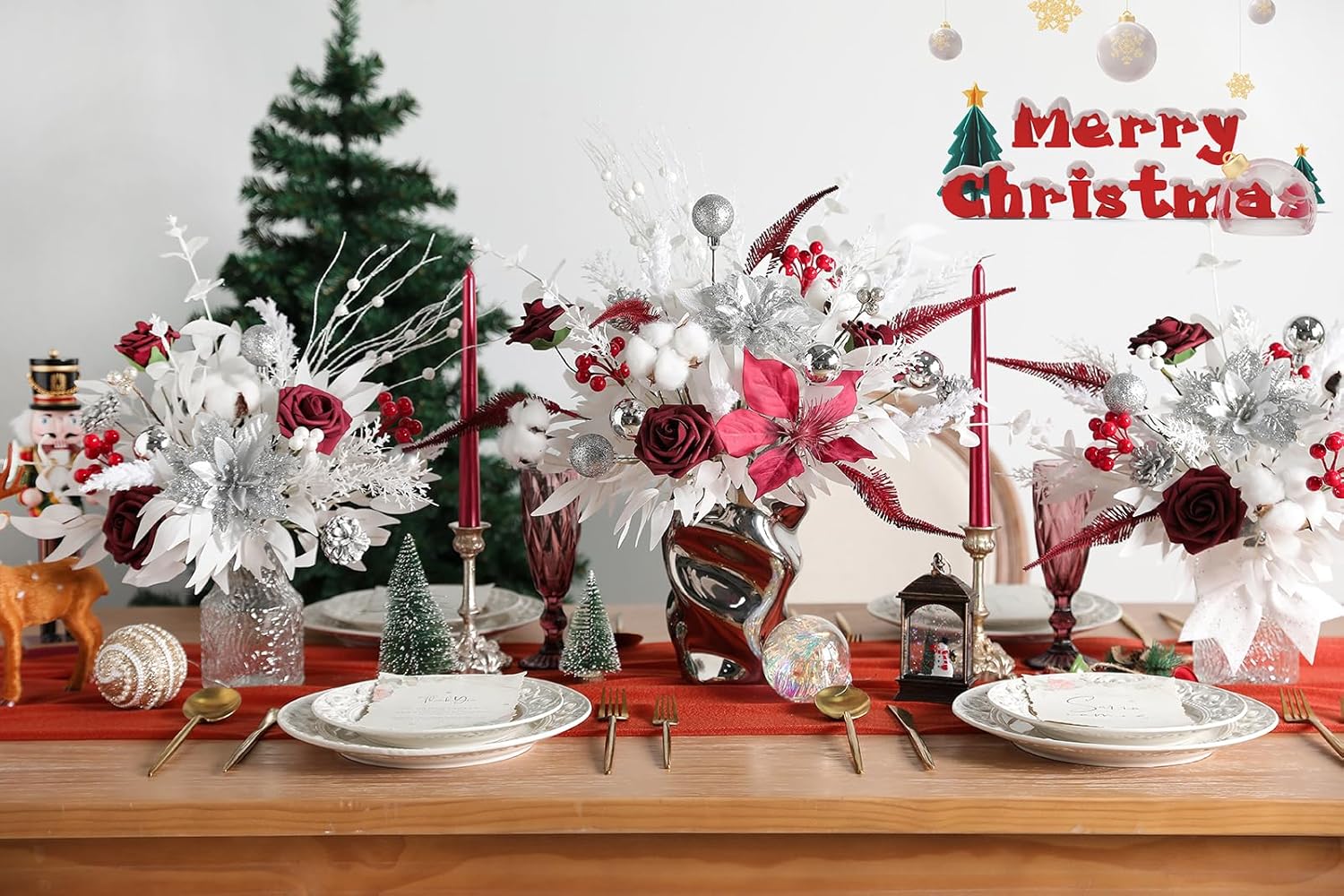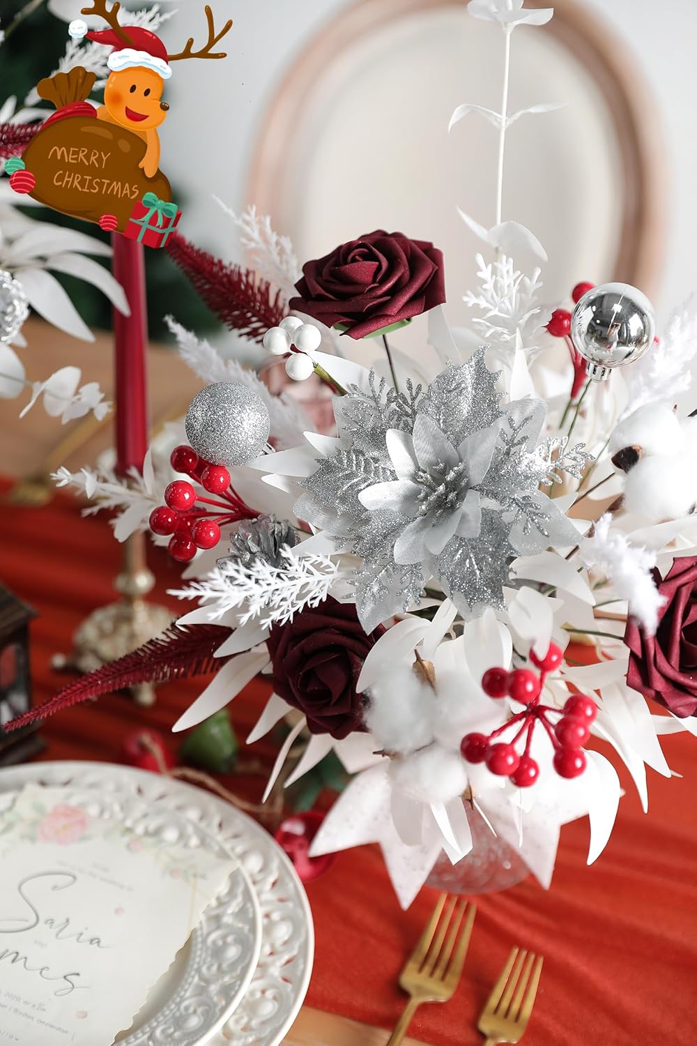 - 58pcs with 12 Kinds;Artificial Red Berry Stems x3,Christmas Balls and Bead Sticks x9,Pine Cones x3,Cotton Stems x4,Eucalyptus Leaves x5,willow leaf x10,Christmas Poinsettia x1,Christmas Bow x1,Artificial Glitter Berry Stem x2,Bunny Tails Grass x4,white astilbe x10,Baby Leaf Fern x6